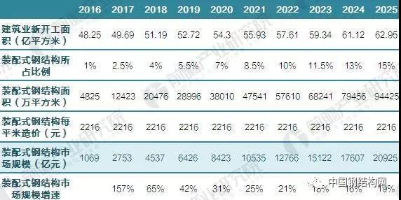 另外,按照政策的普遍要求,未來十年內“裝配式建筑將占新建建筑面積30%、裝配式鋼結構占15%”的比例,預測新增住宅面積每年提高3%,以10年為周期,以現(xiàn)有的裝配式建筑平均價格計算,2025年裝配式鋼結構的市場規(guī)模將達到2萬億元。